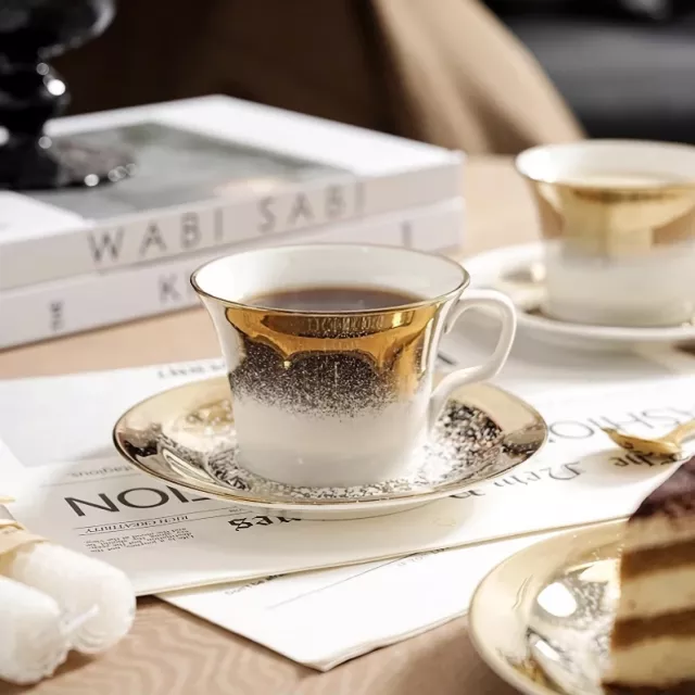 Bring a touch of European charm to your table with this stunning gold and white ceramic coffee cup and snack plate set. Designed with a smooth gradient finish and elegant golden accents, it adds sophistication to every sip. Perfect for daily use or entertaining guests, this set transforms your coffee, tea, or hot chocolate into a delightful experience.
